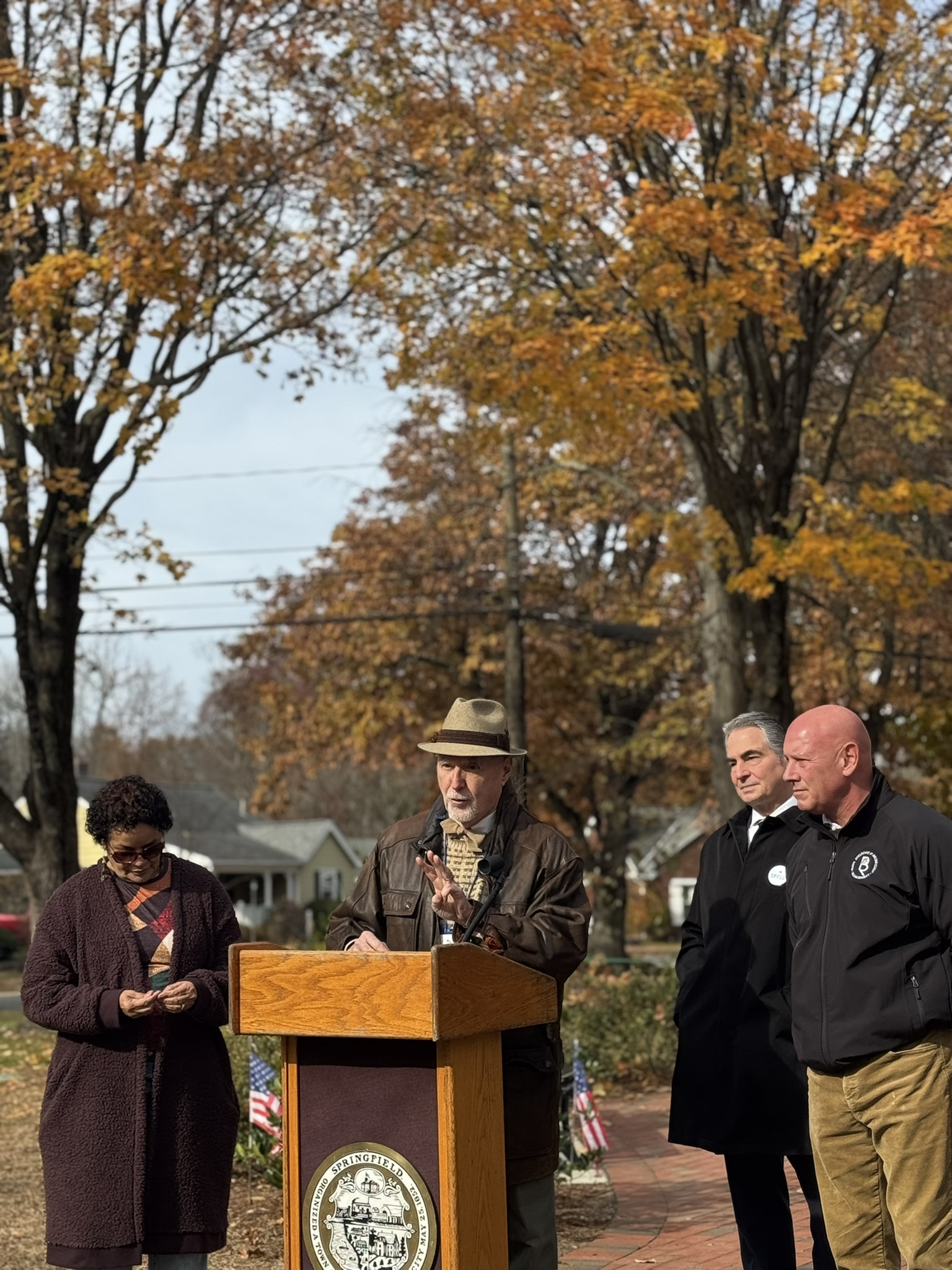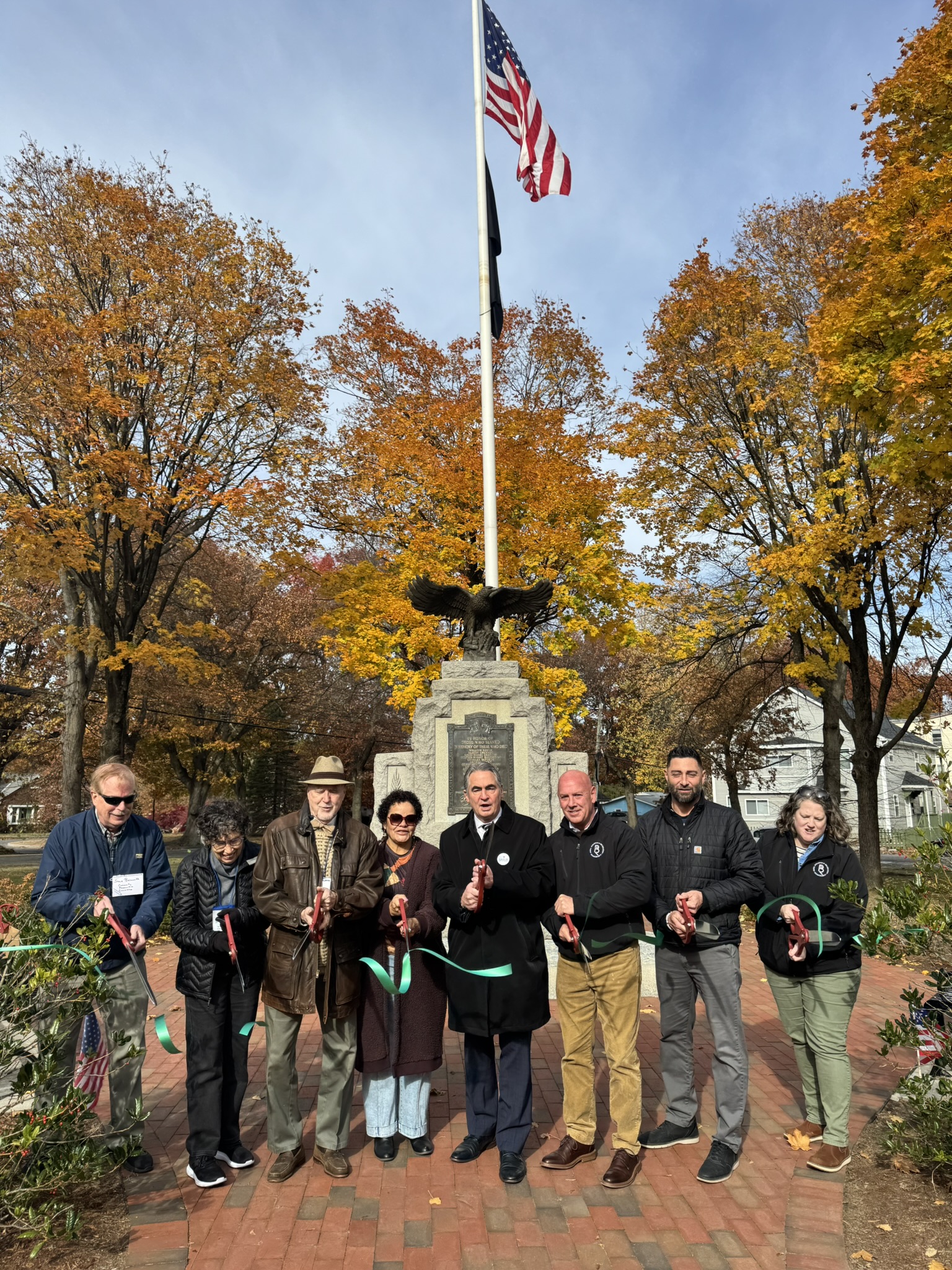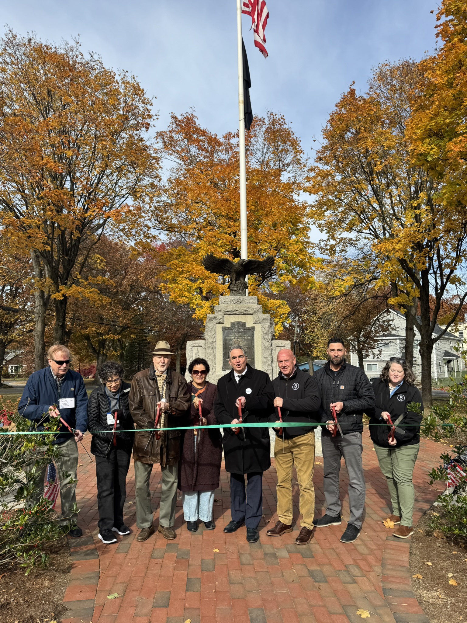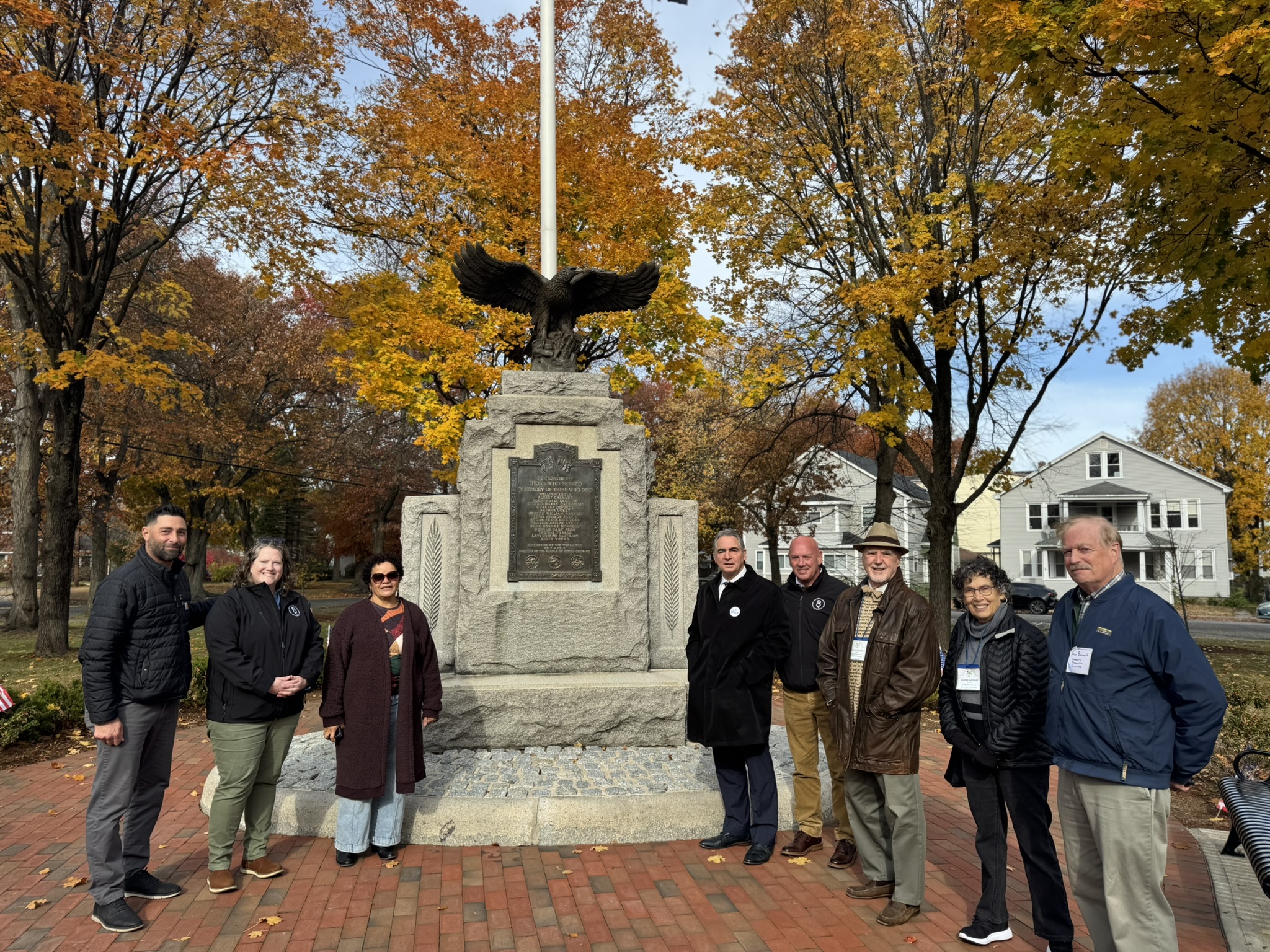 Mayor Domenic J. Sarno, Executive Director of Parks, Buildings, and Recreation Management (PBRM) Director Tom Ashe, Director of Veteran’s Services Joe DeCaro, City Councilor Zaida Govan, the Indian Orchard Citizens Council, members of the Community Preservation Committee (CPC) and CPC Chair Bob McCarroll joined on Friday morning for the unveiling of Godfrey Park Triangle upgrades, the completed restoration of a World War I Memorial, and replacement of the missing bronze eagle.