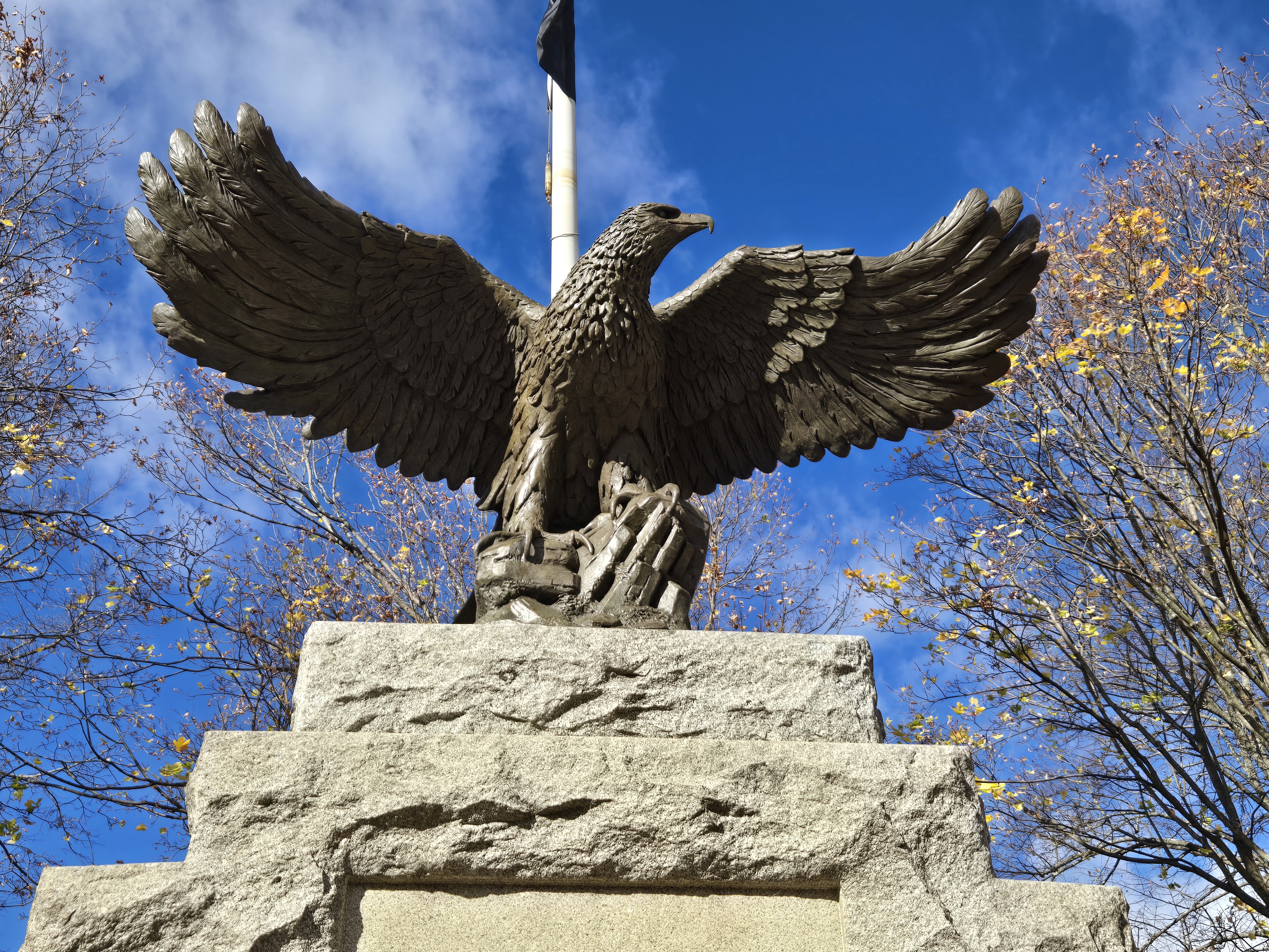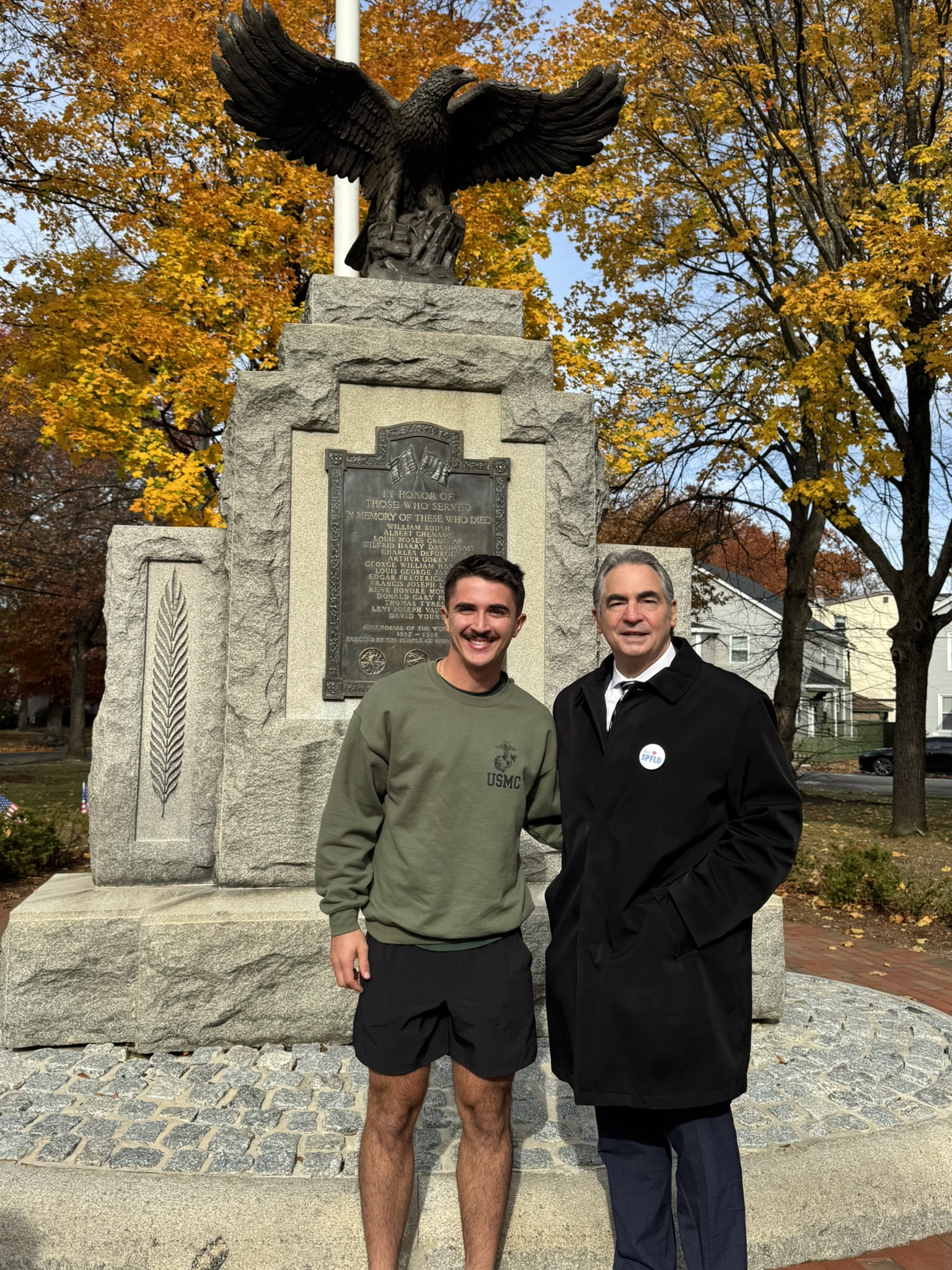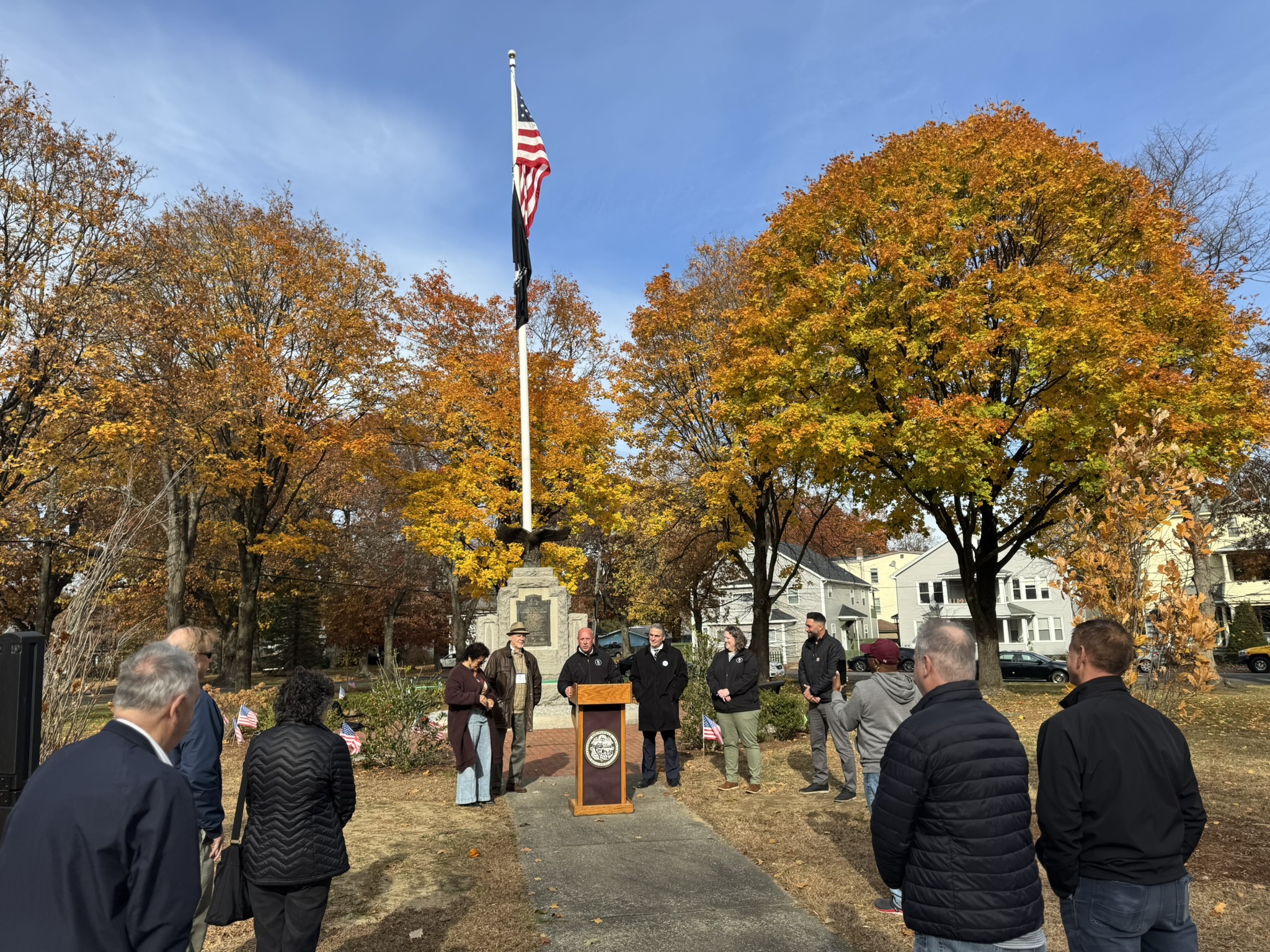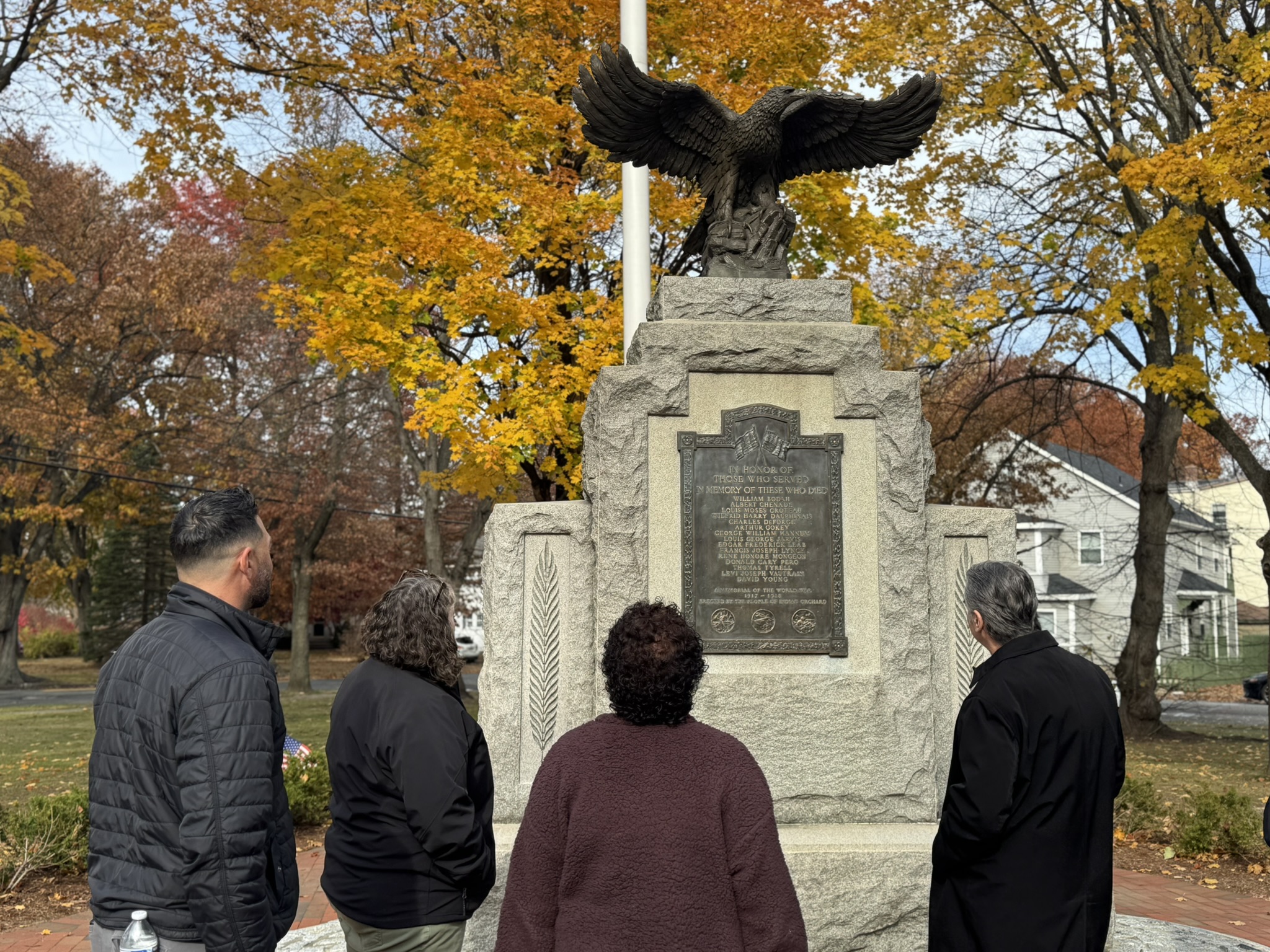 Mayor Domenic J. Sarno, Executive Director of Parks, Buildings, and Recreation Management (PBRM) Director Tom Ashe, Director of Veteran’s Services Joe DeCaro, City Councilor Zaida Govan, the Indian Orchard Citizens Council, members of the Community Preservation Committee (CPC) and CPC Chair Bob McCarroll joined on Friday morning for the unveiling of Godfrey Park Triangle upgrades, the completed restoration of a World War I Memorial, and replacement of the missing bronze eagle.