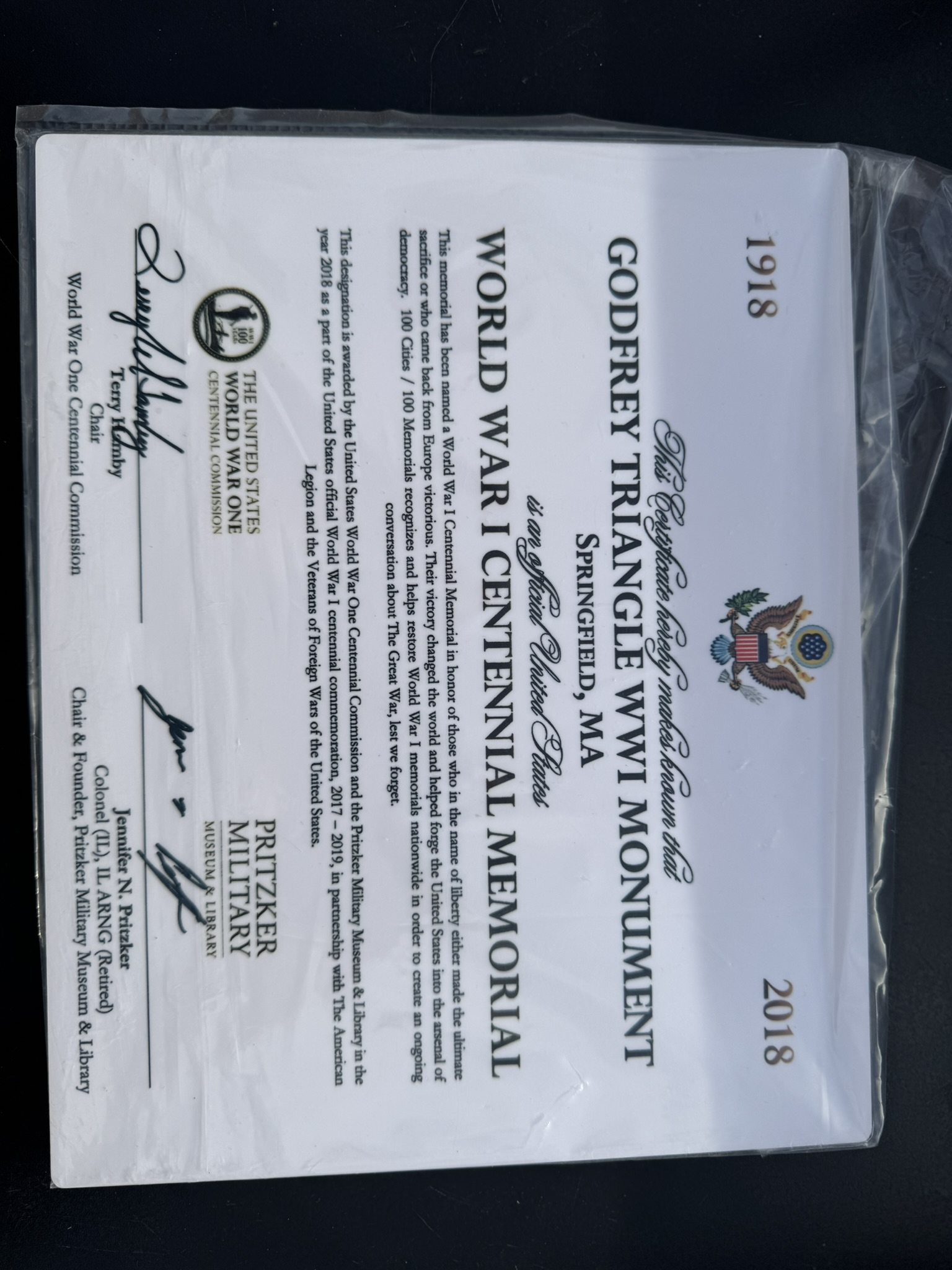 In receiving the 100 Cities/100 Memorials grant, a program that recognizes and helps restore World War I memorials nationwide in order to create an on-going conversation about The Great War, lest we forget. This designation was awarded by the United States World War One Centennial Commission and the Pritzker Military Museum & Library in the year 2018 as part of the United States official World War I centennial commemoration, 2017-2019, in partnership with the American Legion and the Veterans of Foreign Wars of the United States.