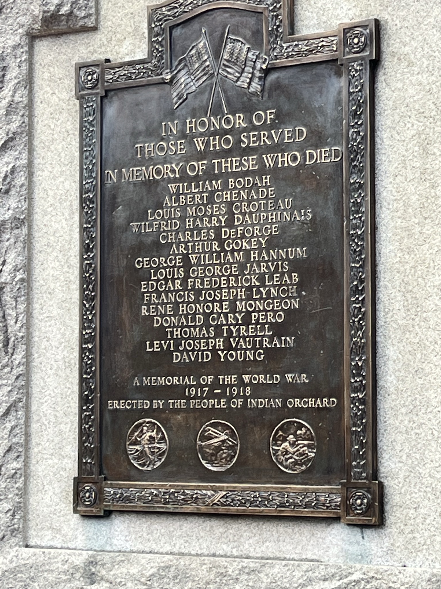 Godfrey Triangle, located in the Indian Orchard neighborhood at the intersection of Berkshire Avenue, and Holly Street, offers .89 acres of open space and includes a memorial to those who served, and those who lost their lives in World War I. The monument is comprised of granite and bronze elements, and originally featured a bronze eagle.