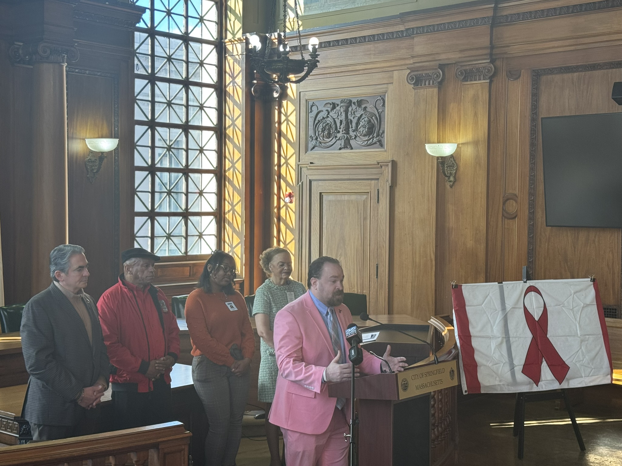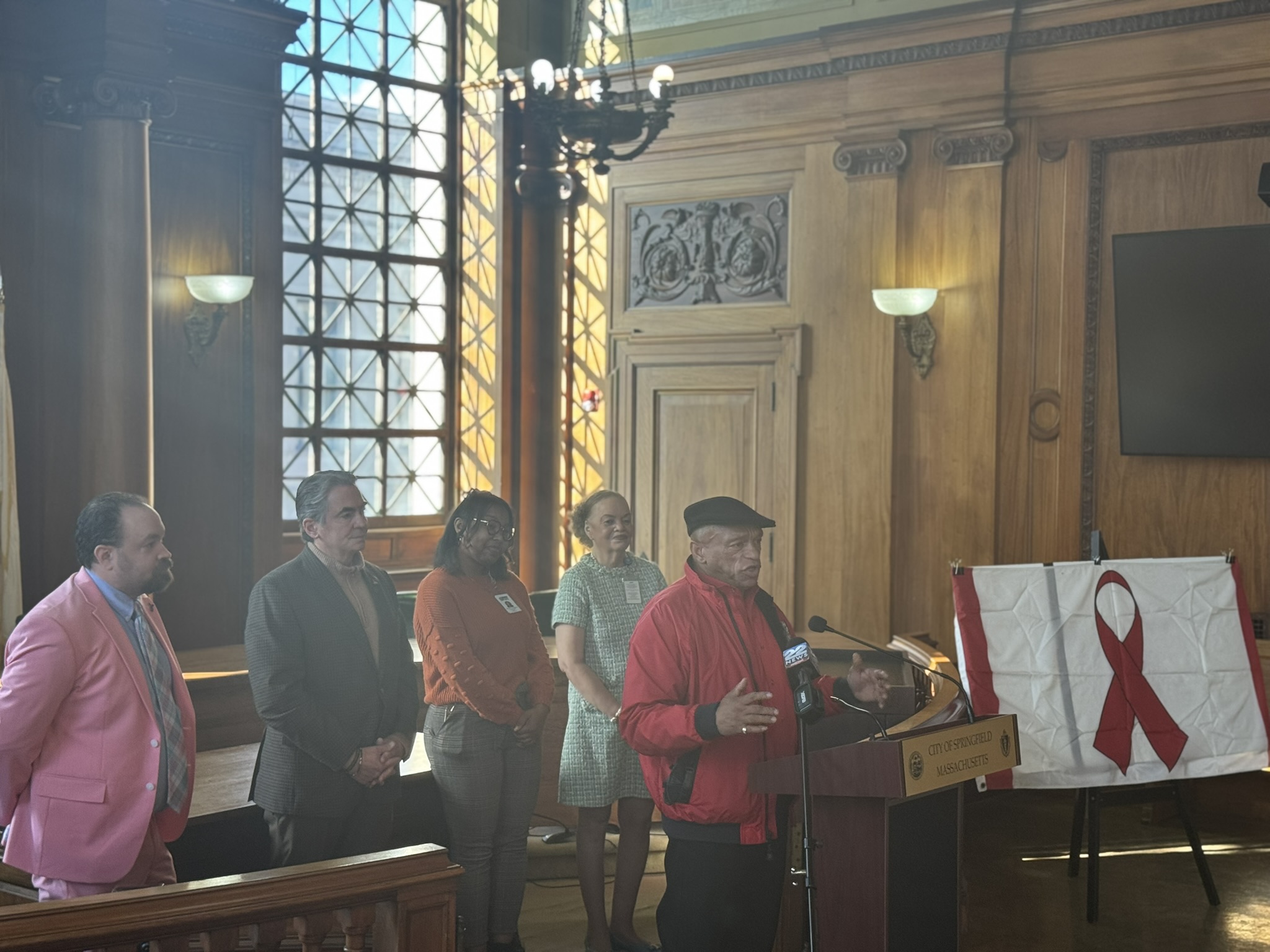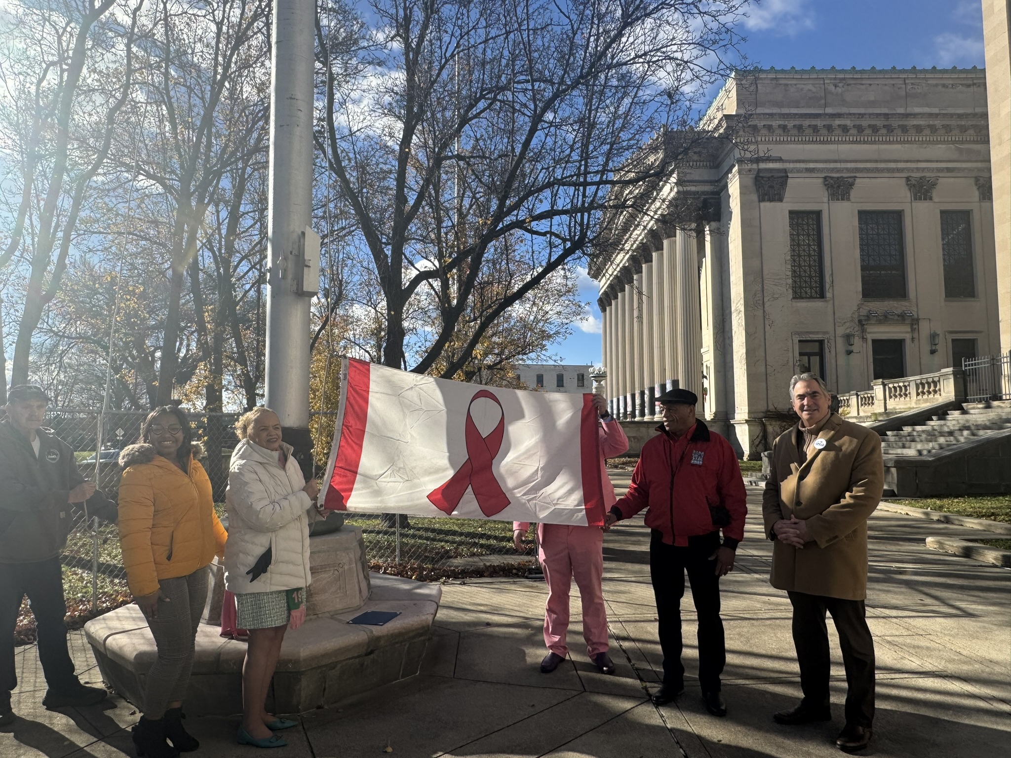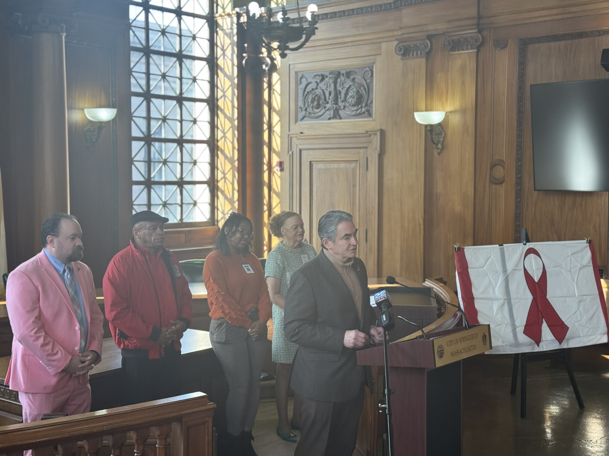 This morning, on December 1, 2025, Mayor Domenic J. Sarno, Health and Human Services Commissioner Helen Caulton-Harris, Racial & Health and Equity Coordinator Shenell Ford, Richard Johnson from the New North Citizens Council, and Jon Marx from the Planned Parenthood League of MA joined to hold the city’s annual flag raising ceremony to acknowledge World AIDS Day.