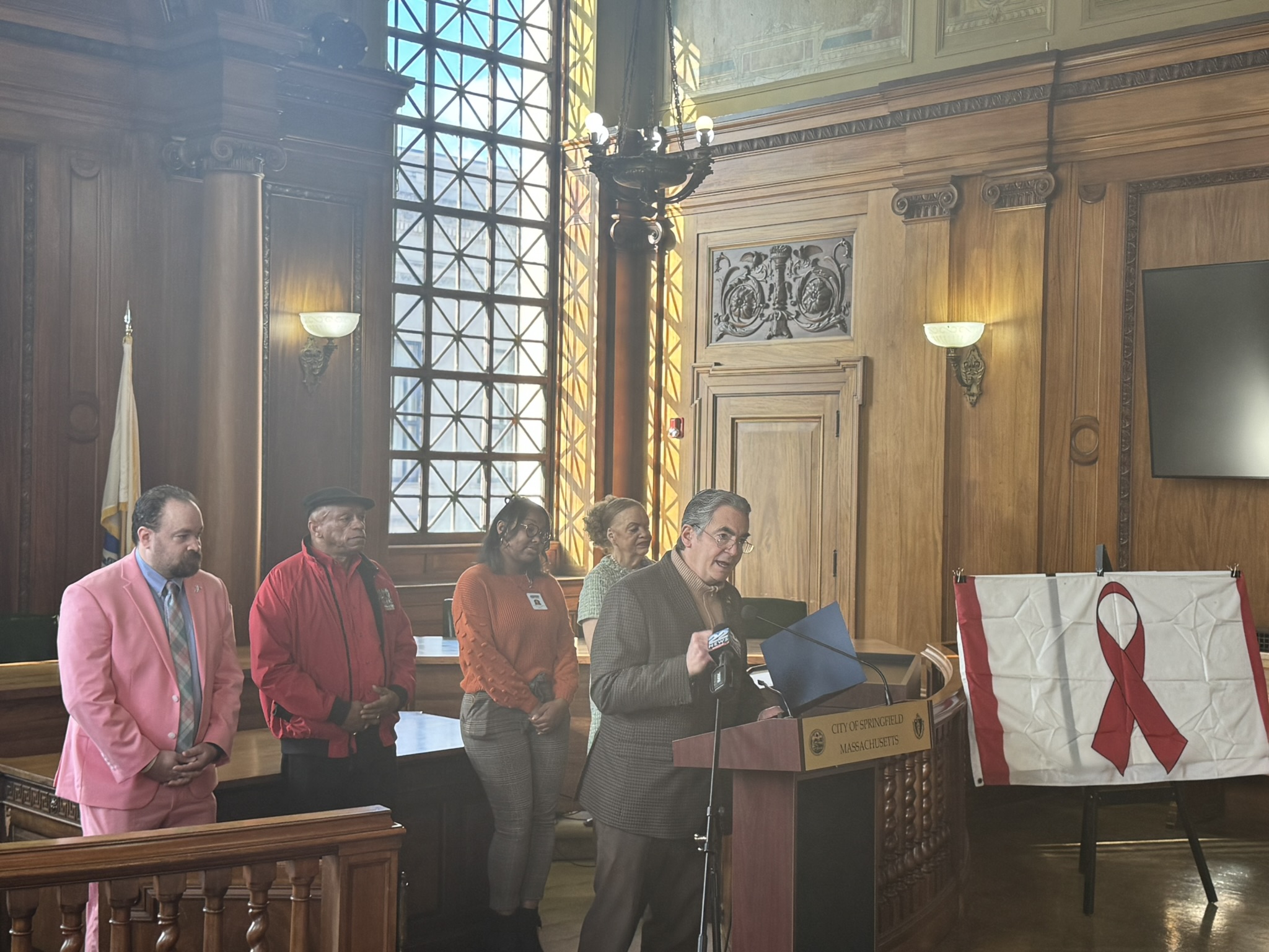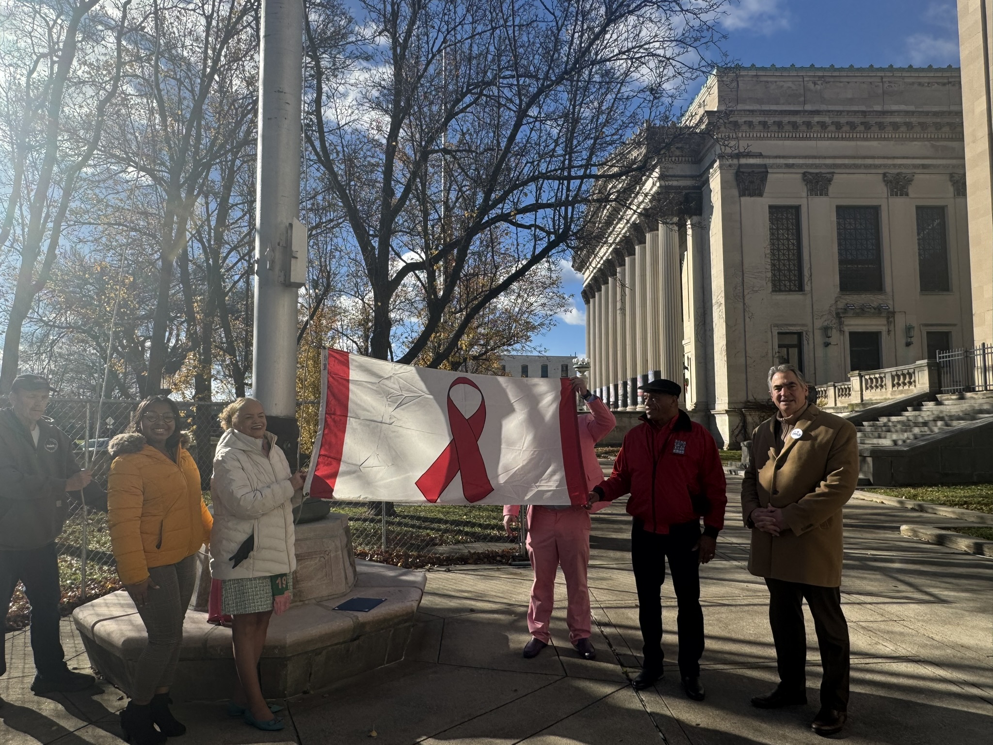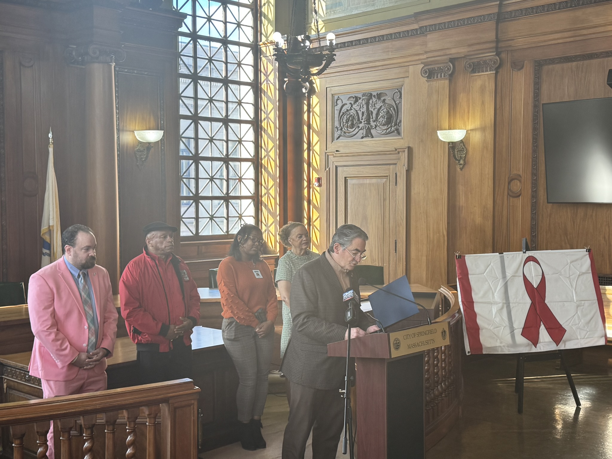 This morning, on December 1, 2025, Mayor Domenic J. Sarno, Health and Human Services Commissioner Helen Caulton-Harris, Racial & Health and Equity Coordinator Shenell Ford, Richard Johnson from the New North Citizens Council, and Jon Marx from the Planned Parenthood League of MA joined to hold the city’s annual flag raising ceremony to acknowledge World AIDS Day.