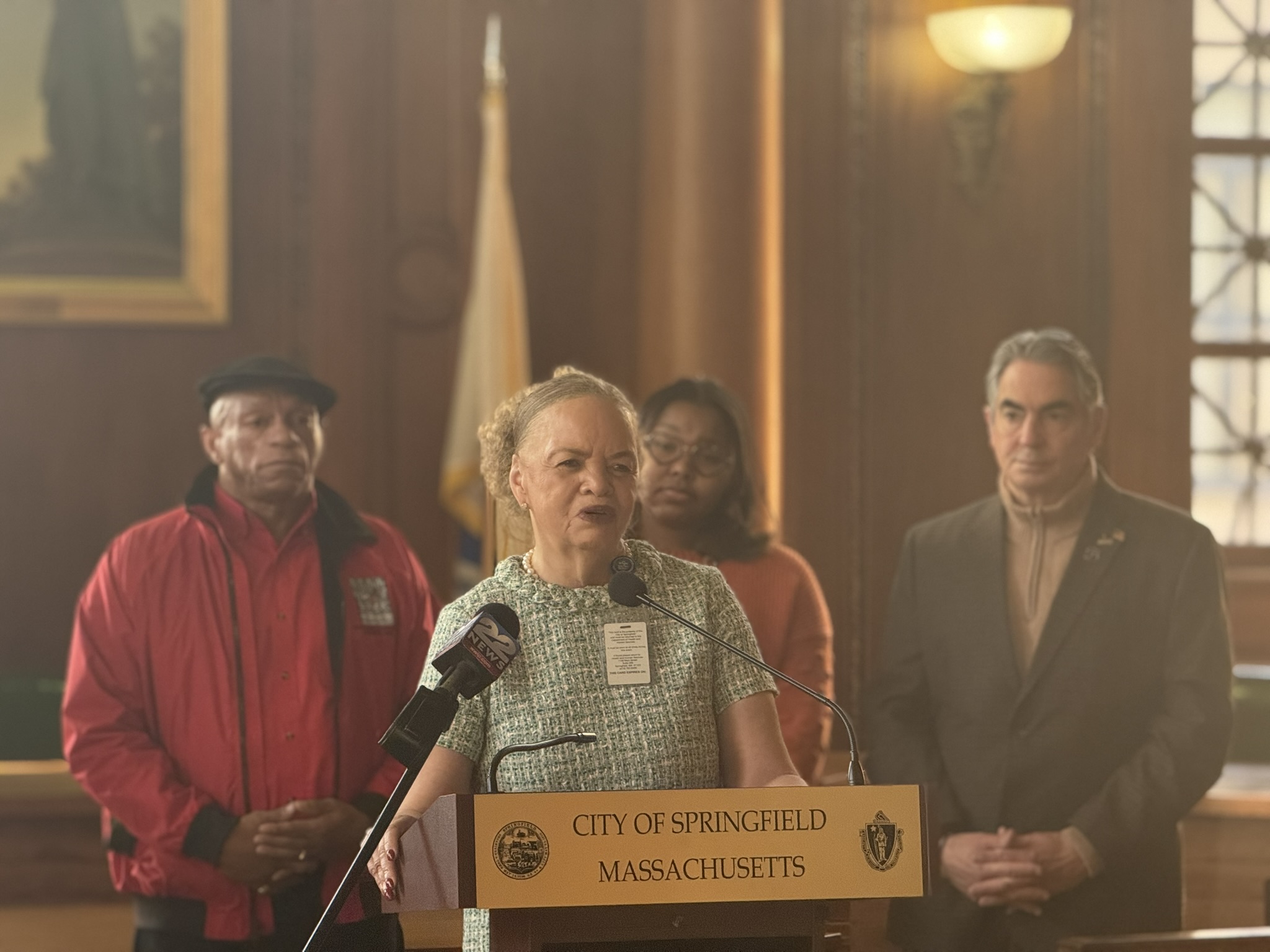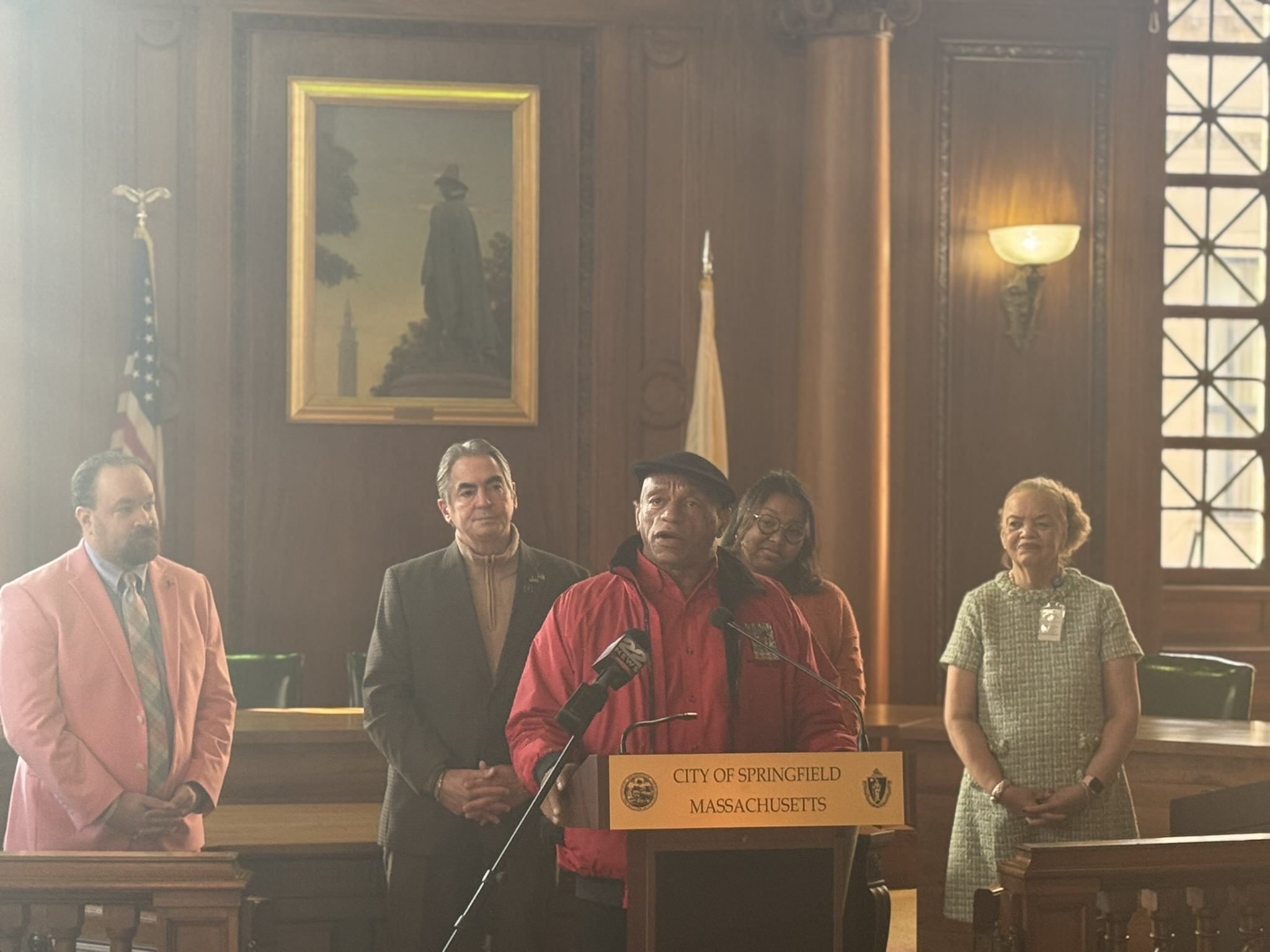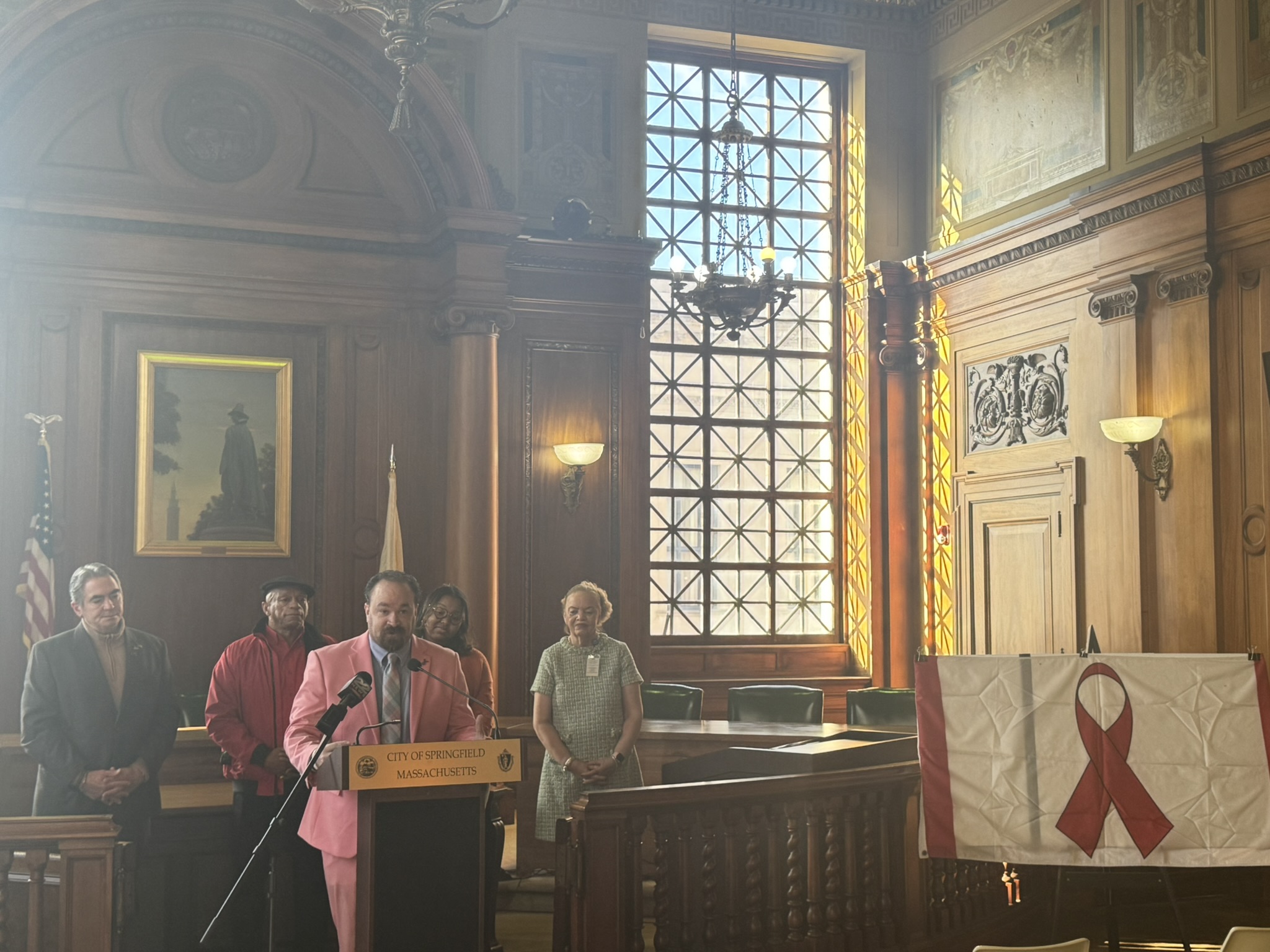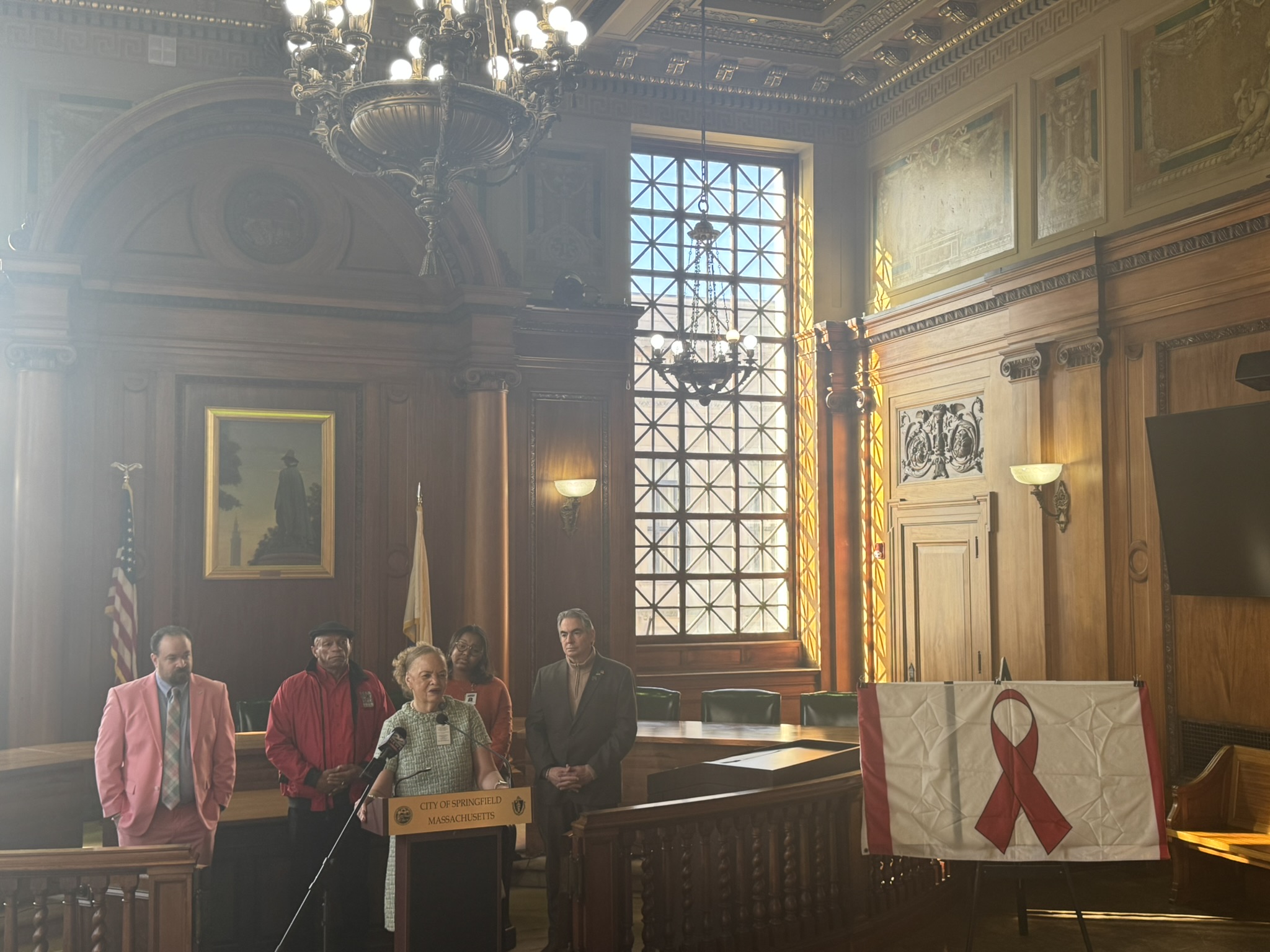 This morning, on December 1, 2025, Mayor Domenic J. Sarno, Health and Human Services Commissioner Helen Caulton-Harris, Racial & Health and Equity Coordinator Shenell Ford, Richard Johnson from the New North Citizens Council, and Jon Marx from the Planned Parenthood League of MA joined to hold the city’s annual flag raising ceremony to acknowledge World AIDS Day.