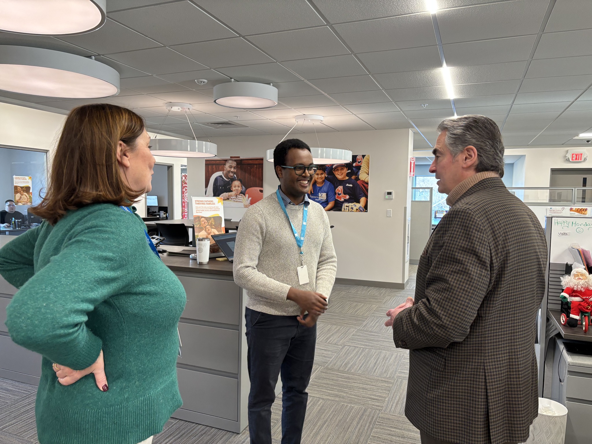 Mayor Domenic J. Sarno, wife Carla Sarno and Executive Director of Parks, Buildings, and Recreation Management Tom Ashe stopped in to visit and see the new Square One, a new state-of-the-art facility at their new location at 186 William Street. Their former location was destroyed by the 2011 tornado.