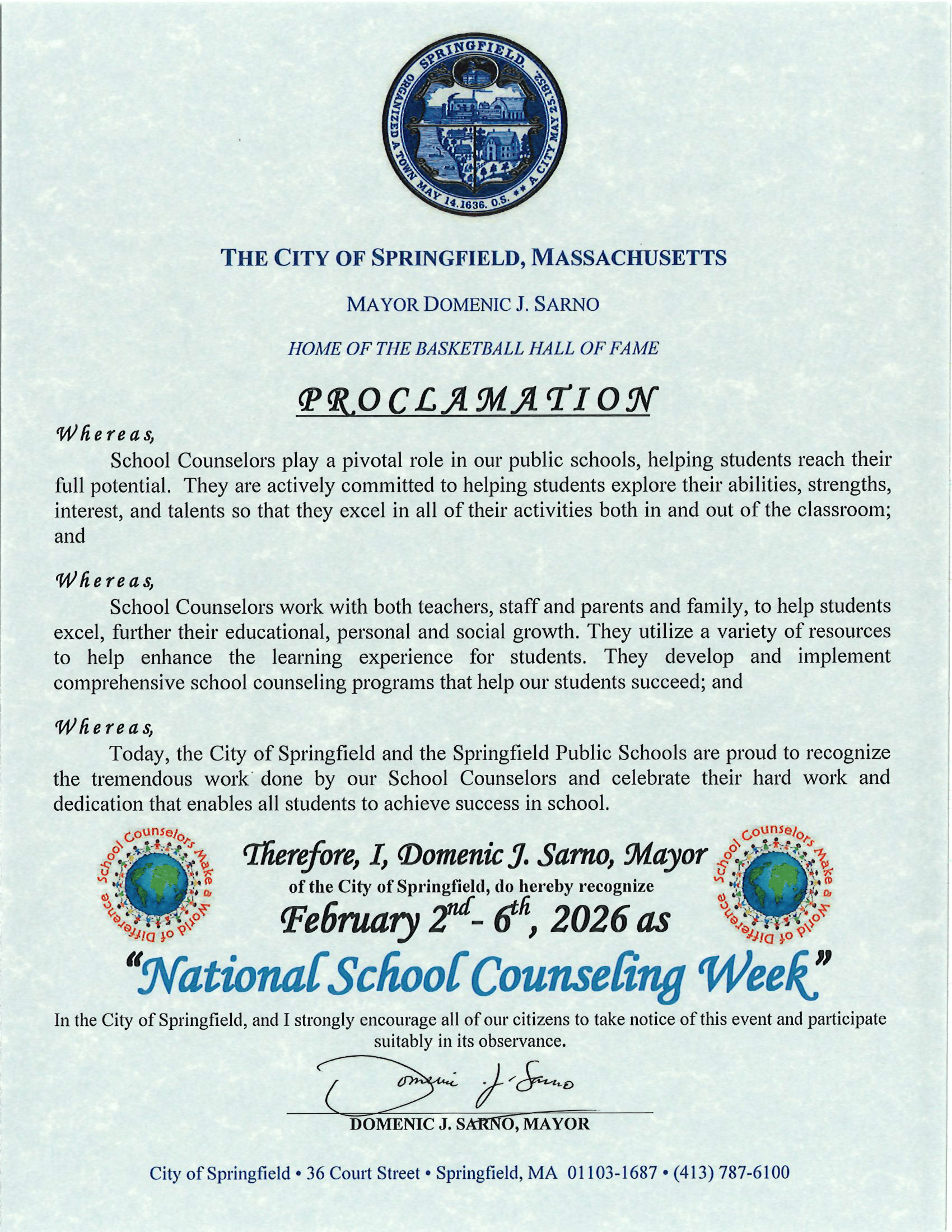 Mayor Domenic J. Sarno acknowledges National School Counseling Week and thanks all of our School Counselors for their continued dedication and efforts in helping our students dream big.