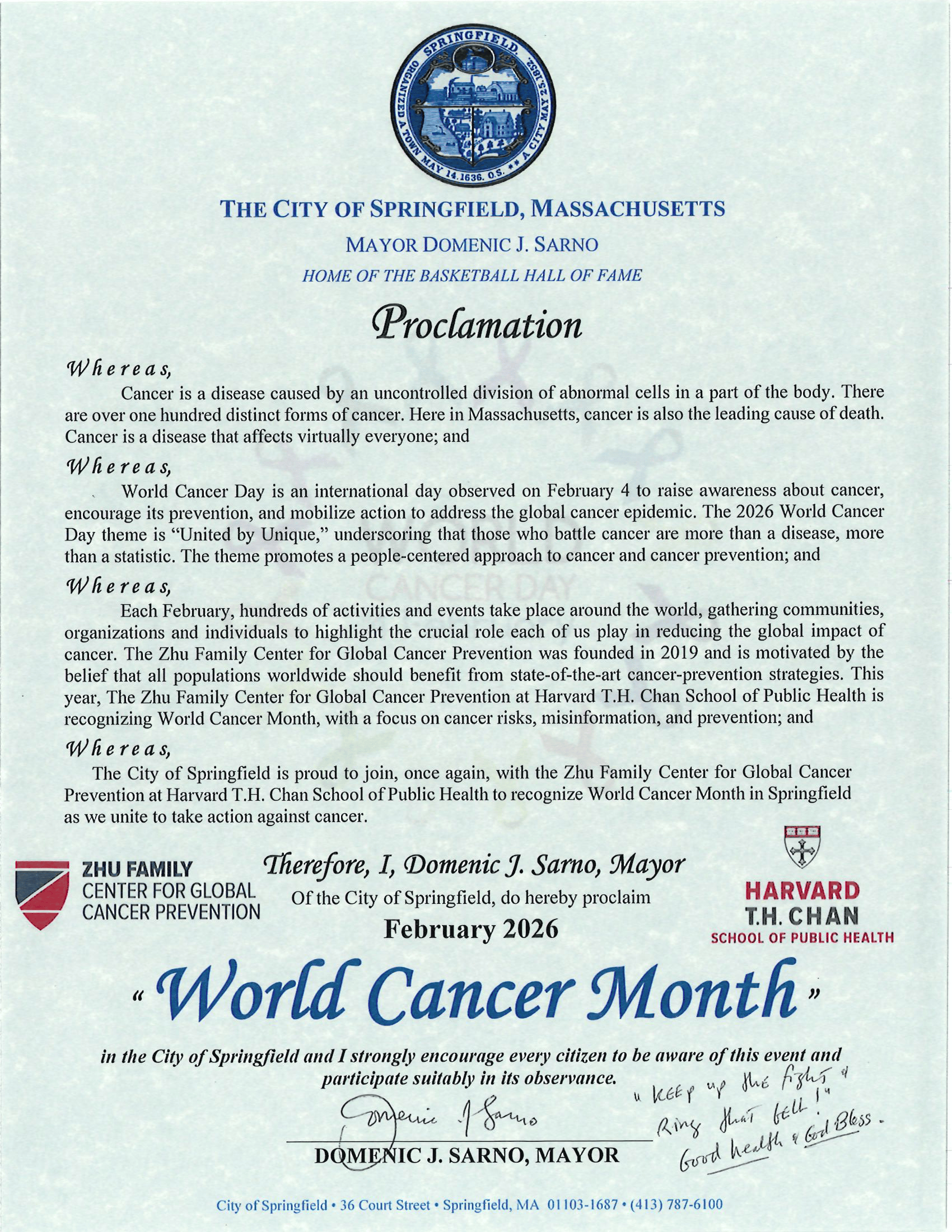 Springfield is pleased to welcome this educational resource to the city. Mayor Domenic J. Sarno, on behalf of the City of Springfield, is proud to join, once again, with the Zhu Family Center for Global Cancer Prevention at Harvard T.H. Chan School of Public Health to recognize World Cancer Month in Springfield as we unite to take action against cancer.