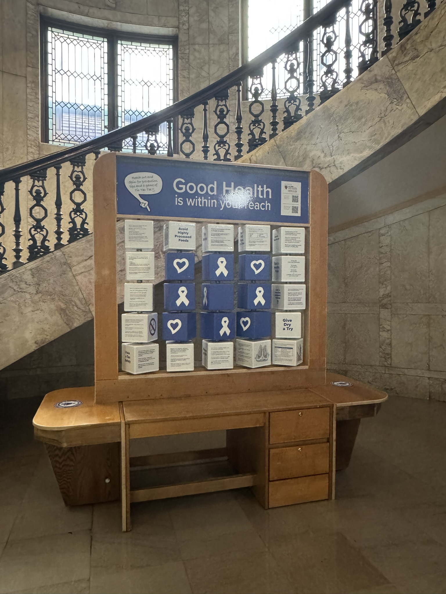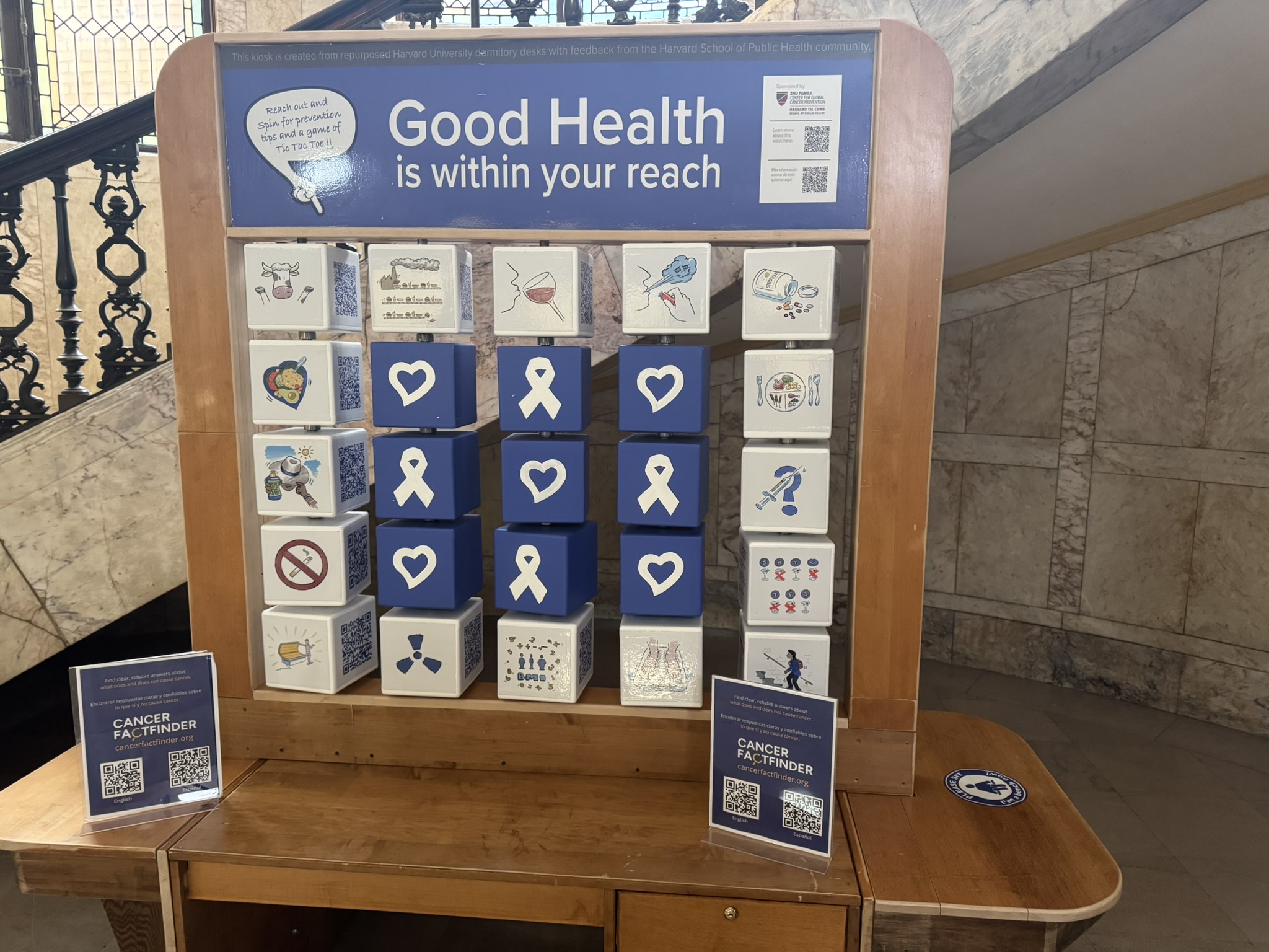 The interactive educational kiosk was made from decommissioned desks. It conveys tips for reducing risks for Cancer through everyday tasks in simple language on spinning blocks. Additionally, there are QR codes on the blocks allowing for resources to be accessed even after a visit to the station. The blue blocks in the middle are a tic-tac-toe board – come try it out! The Kiosk was designed by the Zhu Family Center for Global Cancer Prevention at the Harvard T.H. Chan School of Public Health and made with repurposed materials like old Harvard dormitory desks. The Kiosk is making its way around Western Mass, and was recently hosted in Chicopee.