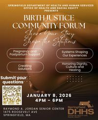 Please join the Springfield Dept of Health & Human Services, Office of Health & Racial Equity for a Birth Justice Community Forum focused on centering lived experiences and advancing equitable,…