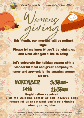 The Department of Elder Affairs/Council on Aging (COA) works to improve and enhance the quality of life for elder residents in Springfield. It advocates, plans, develops, coordinates and provides social services as well as information and referral services for Springfield's elder citizens.
