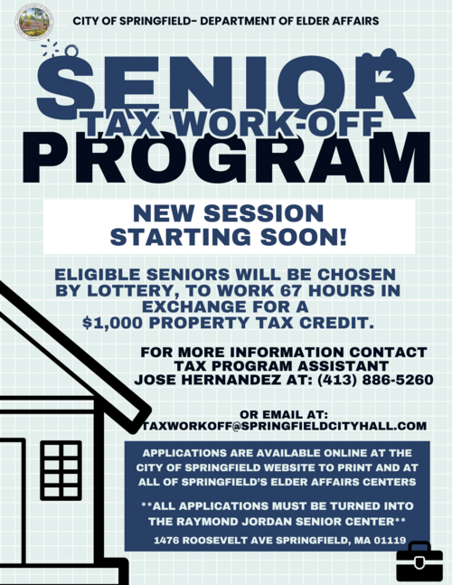 Applications will be available at the City of Springfield Department of Elder Affairs offices and the Assessor’s office, as well as on the City Webpage via a downloadable PDF that must be filled out and submitted in person to the Elder Affairs office. Senior residents interested can submit an application beginning February 10th. For more information, seniors may contact us at 413-886-5260, or by email at TaxWorkOff@springfieldcityhall.com