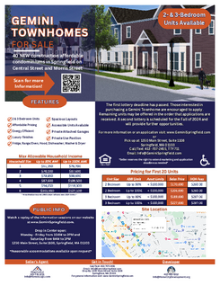 Gemini Townhomes is a new homeownership development in Springfield. The project, supported with funding from the City of Springfield, MassHousing, and the US Department of Housing and Urban Development, makes homeownership available at an affordable price. Call 413-707-2455 or see the flyers below for more information.