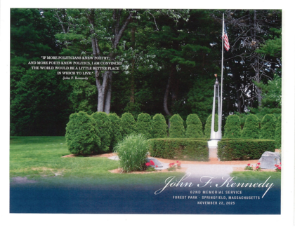 Mayor Domenic J. Sarno, Congressman Richard E. Neal, and Sheriff Nick Cocchi will join the Springfield Board of Park Commissioners, Executive Director of Parks, Buildings, and Recreation Management (PBRM) Thomas Ashe, James E. Sullivan, and members of the JFK Remembrance Committee on Saturday afternoon for the 62nd annual JFK Remembrance Ceremony at the Eternal Flame in Forest Park. The remembrance is held annually to honor the memory of President John F. Kennedy on the date of his assassination: November 22, 1963 in Dallas, Texas.