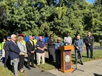 Mayor Domenic J. Sarno and city officials, including Director of Parks, Buildings, and Recreation Management Thomas Ashe, Springfield Public Schools Superintendent Dr. Sonia Dinnall, Police Superintendent Lawrence Akers, Health & Human Services Commissioner Helen Caulton-Harris, School Committee member and Old Hill Neighborhood Council President Barbara Gresham, Ward 5 City Councilor Lavar Click-Bruce, who chairs the City Council Subcommittee on Public Safety, and City Councilor Brian Santaniello joined at Johnny Appleseed Park on Thursday morning with Hampden County Sheriff Nick Cocchi and team to announce the expansion of the City and the Hamden County Sheriff’s Office public safety partnership in our Springfield parks.