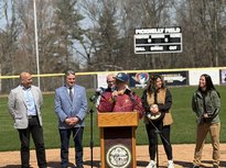 Mayor Domenic J. Sarno, Congressman Richard Neal, Parks, Buildings, and Recreation (PBRM) Director Thomas Ashe, and Department of Capital Asset Construction (DCAC) Peter Garvey joined on Monday, along with Westfield Starfires GM Chris Thompson and Government Relations Director for Wellpoint insurance Michael Vazquez to unveil the completed $4 million major renovations to the historic Walker Memorial Grandstand baseball stadium and diamond located inside Forest Park.
