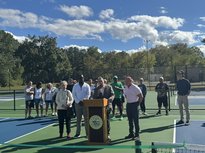 Mayor Domenic J. Sarno and Director of Parks, Buildings, and Recreation Management (PBRM) Tom Ashe, City Councilors Lavar Click-Bruce and Kateri Walsh, city officials, and partners from GZA contractors joined the Springfield Pickleball Association organized by retired Springfield Police Lt. Erwin Greene on Friday afternoon to unveil the completion of the new pickle ball courts at Greenleaf Park. There are now six pickleball courts and one resurfaced tennis court at the park located in the Sixteen Acres neighborhood on Parker Street.