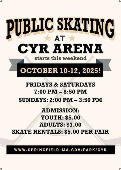 Mayor Domenic J. Sarno and Executive Director of Parks, Buildings and Recreational Management (PBRM) Tom Ashe announced today the return of public skating hours at the renovated Cyr Arena starting Friday, October 10th, 2025. The arena is located in Forest Park and is accessible via the Trafton Road entrance.