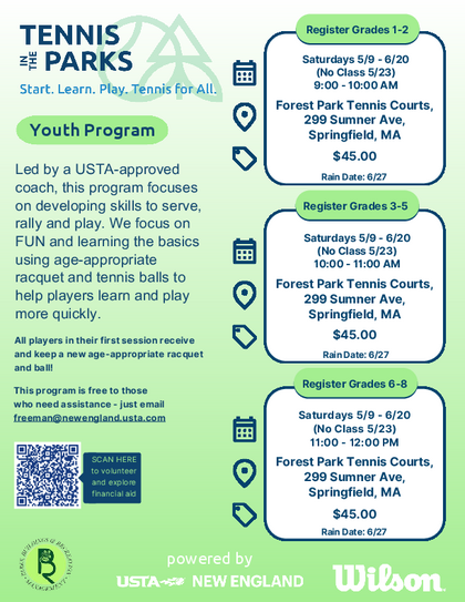 Springfield Parks and Recreation is excited to team up with Tennis in the Parks, guided by a USTA-approved coach! Designed for beginners and first-time players, this program makes learning tennis fun and easy through play.