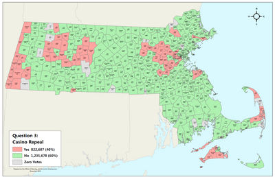 The Repeal the Casino Deal movement and Ballot Question 3 was defeated in a statewide vote which divided the population not along party lines, but along beliefs about whether the benefits of having a casino gaming facility would outweigh the potential negatives. Read More